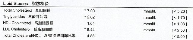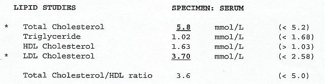 Pengalaman sendiriSaya telah membuat ujian darah pada 12 November 2013. Hasil ujian darah itu, antara lain, menunjukkan bahawa tahap kolesterol saya sangat tinggi. Hasil ujian darah itu adalah seperti berikut: